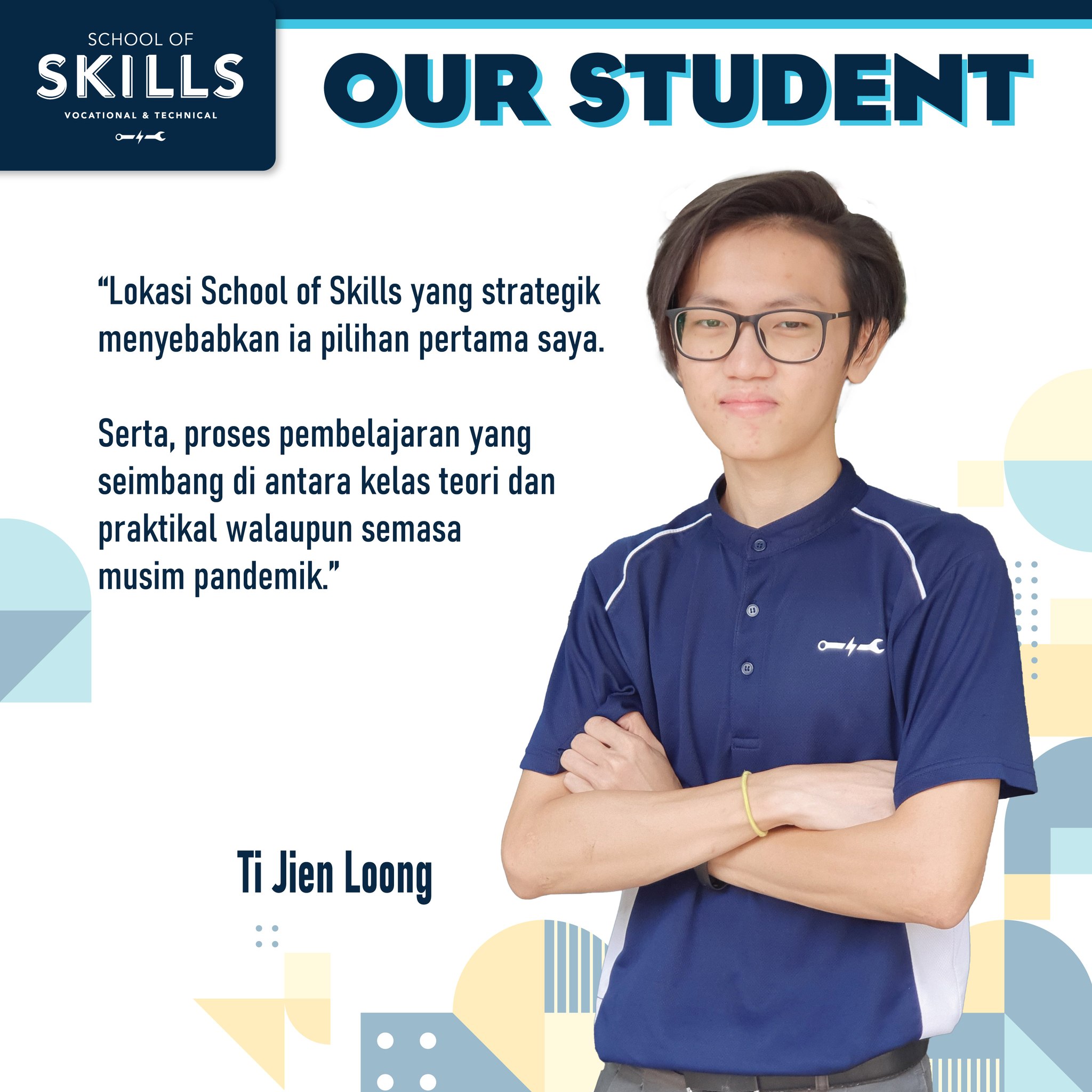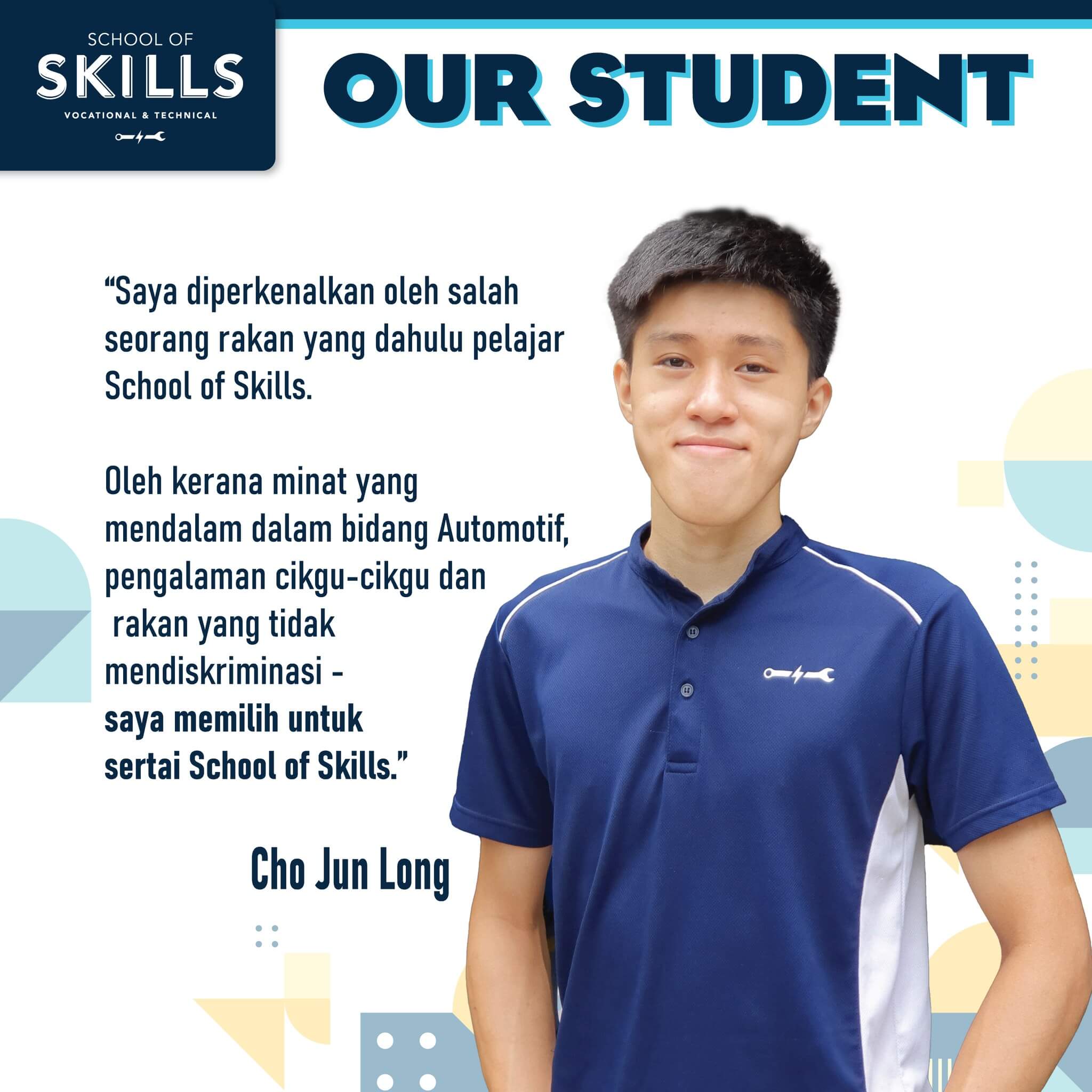 Saya diperkenalkan kepada School of Skills oleh seorang rakan yang pernah belajar di sini. Disebabkan minat saya dalam bidang automotif dan kursus-kursus yang ditawarkan, saya memutuskan untuk mendaftar di School of Skills juga. Sejak itu, saya menikmati setiap detik waktu saya di sini.